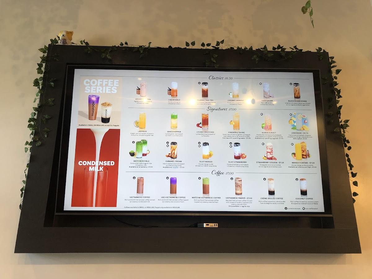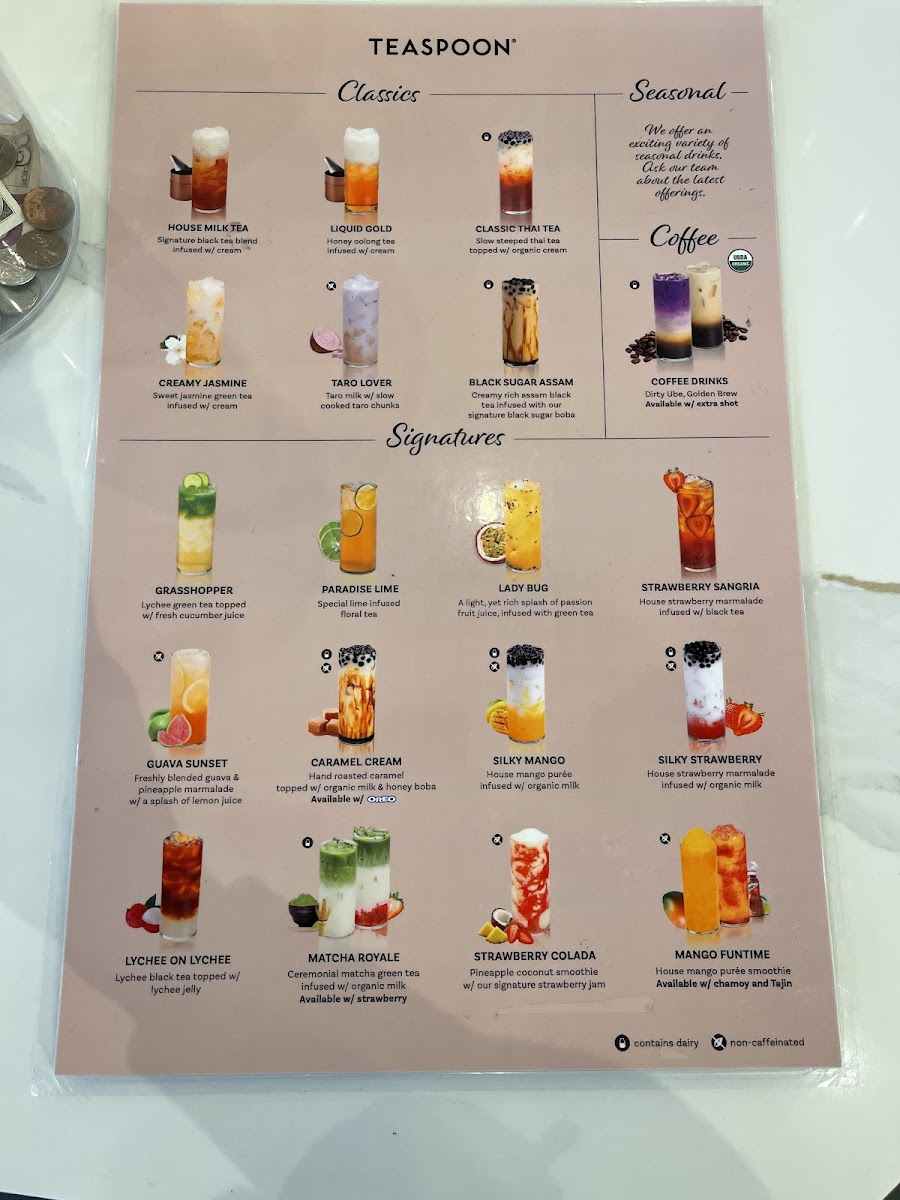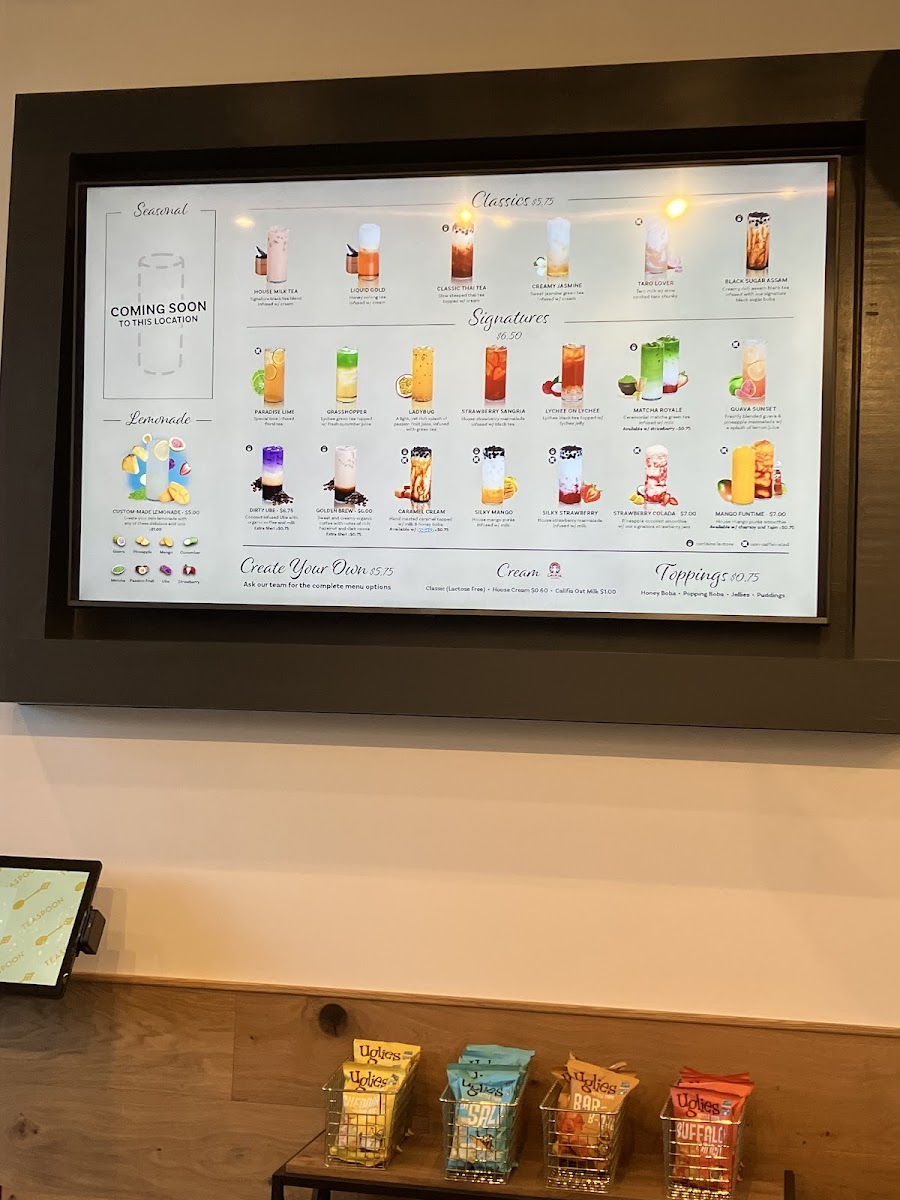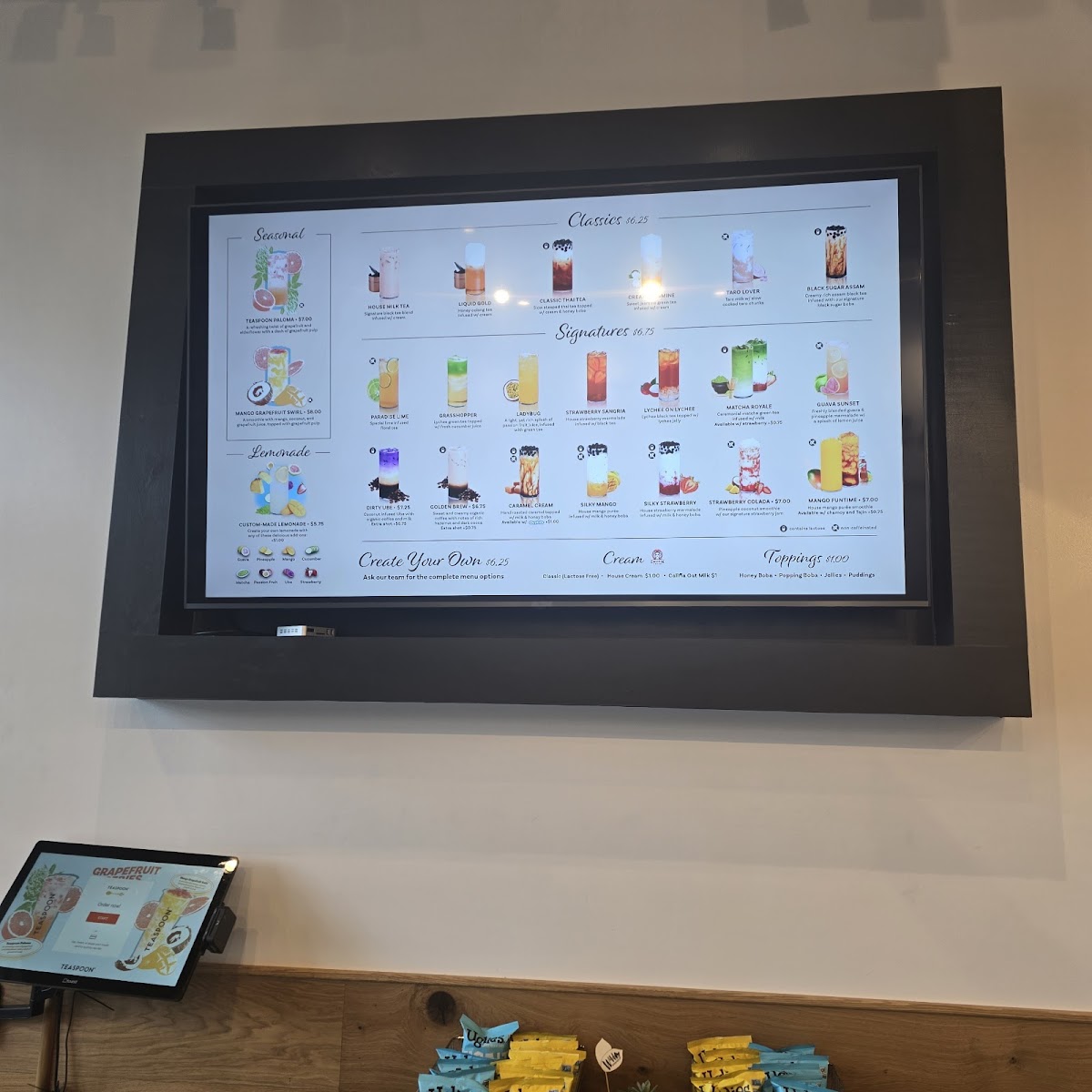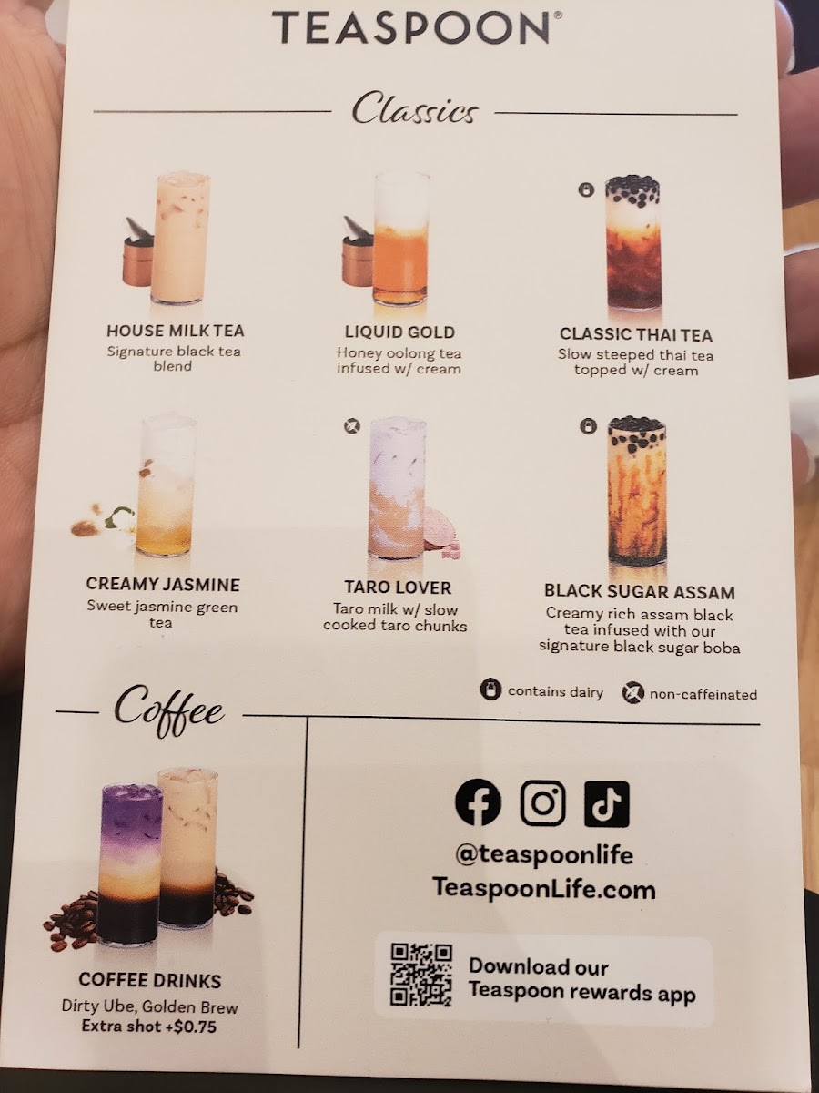 Teaspoon Augusta offers a delightful variety of drinks and snacks, perfect for any occasion. Their Signature drinks, such as the Grasshopper, Silky Mango, and Guava Sunset, stand out for their vibrant flavors, with options like the Mango Funtime Smoothie and Mango On Fire Smoothie providing a refreshing twist. Hot drink lovers can indulge in a selection of warm beverages, including the Hot Coconut Coffee, Hot Genmaicha Green Tea, and Hot Classic Thai Tea. For coffee enthusiasts, the Coconut Coffee, Hot Vietnamese Coffee, and Signature Latte are popular choices, with a standout being the Creme Brulee Coffee from the Most Popular menu. If you're craving something savory, their Hot Food options like Edamame Rolls, Honey BBQ Tater Tots, and Nashville Hot French Fries complement the drinks perfectly. For larger gatherings, the Party Pour selections, such as the Vietnamese Coffee - Party Pour and Taro Lover - Party Pour, offer a generous 59 oz serving ideal for sharing. If you're looking to experiment, the Create Your Own section lets you mix and match teas like Rose Petal Oolong Tea and Jasmine Green Tea. For those with a sweet tooth, Snacks like Macaron 3 Pc and Chocolate Brownie are great options to enjoy with your drink. The menu also features a few New items like the Cupid's Kiss and Tiramisu Latte for something extra special.